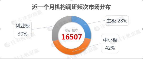 从板块上看,近一月机构调研频次最多的是中小板上市公司,占比为42%,其次是创业板上市公司,占比30%,最后是主板上市公司,占比为28%。